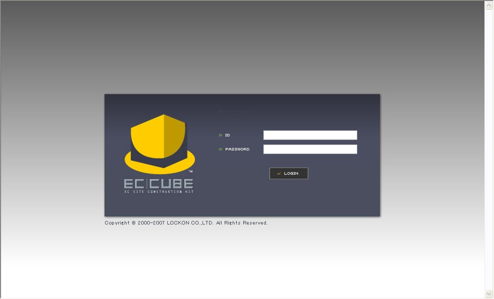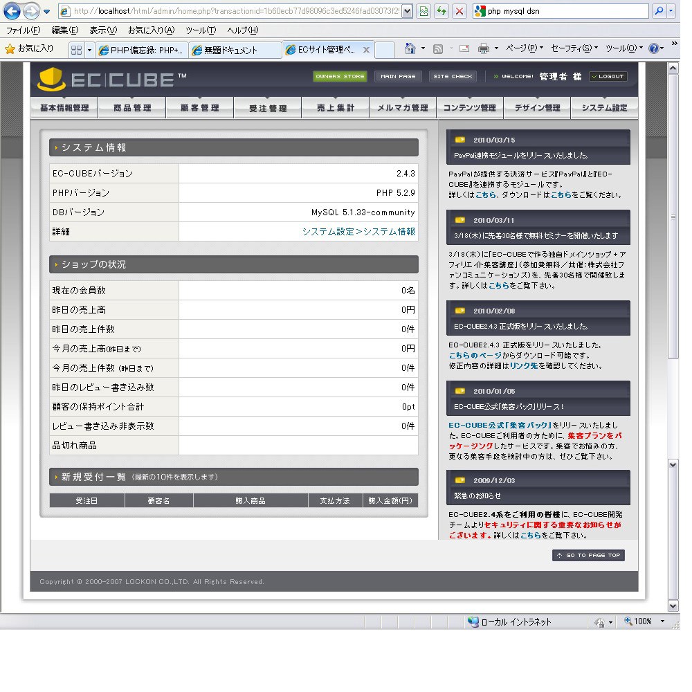 管理画面で、インストール時④ECサイトの設定で適当に入力したログインIDとパスワードを入力すると、以下のような管理画面トップに遷移します。